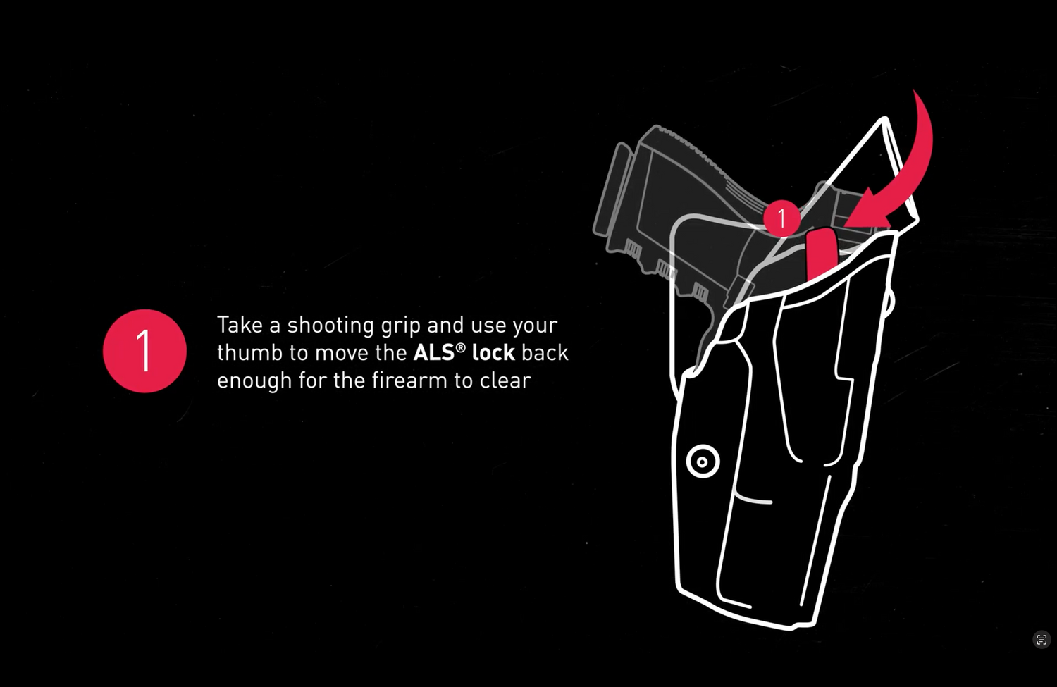 A Safariland Duty Rated Level I Retention holster is equipped with the ALS® (Automatic Locking System), which requires one manual hand movement to release the firearm from the holster.